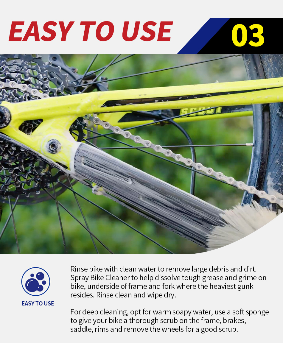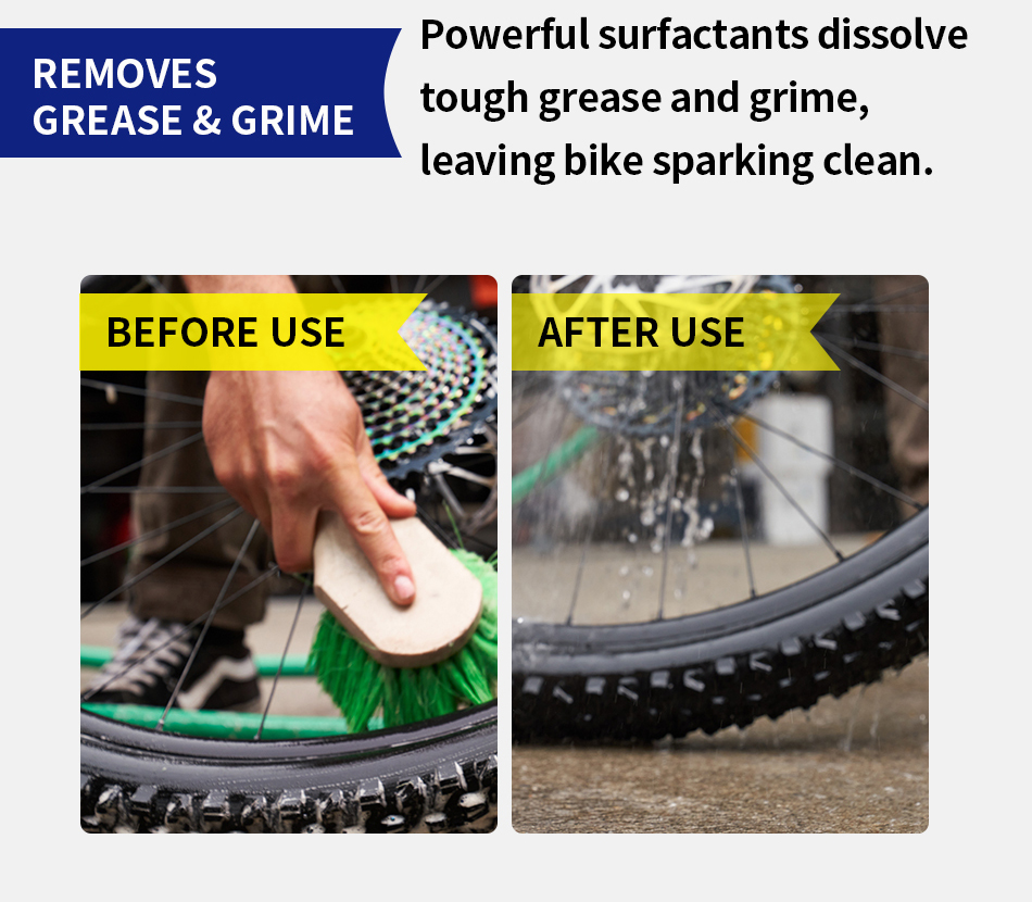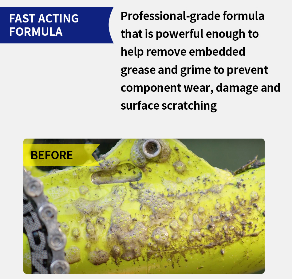 Spray to help dissolve tough grease and grime on the bike, not forgetting the underside of the frame and fork where the heaviest gunk resides. Safe for all bike surfaces including carbon fiber, titanium, aluminum, steel, chrome, rubber and plastic.