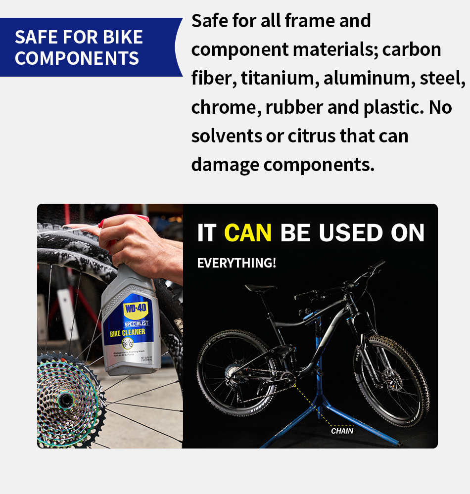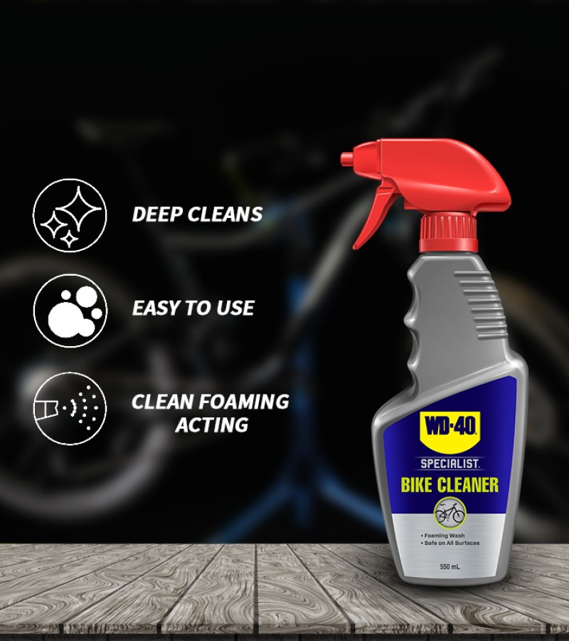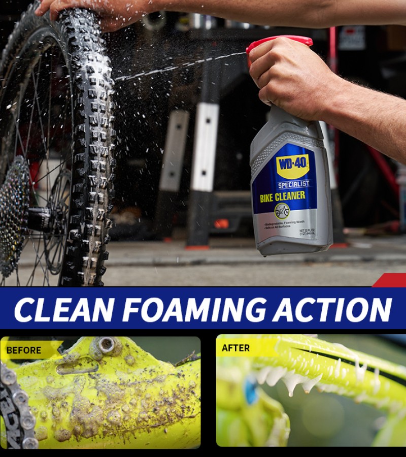 WD-40 Specialist® Bike Cleaner is a biodegradable foaming wash that is easy-to-use and safe on all parts and surfaces. Experience the difference of a professional-grade formula that is powerful enough to help remove embedded grease and grime to prevent component wear, damage and surface scratching. Developed for cyclists and mechanics who love keeping their ride in top condition.
